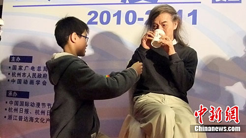 “感動”似乎是蔡志忠創(chuàng)作的靈感與追求。據(jù)悉,在2009年7月,蔡志忠正式簽約入駐杭州之江文化創(chuàng)意園,把自己的下半生許給了杭州。在今天的拜師儀式上,蔡志忠再次訴說了他的“感動”:“我三歲半開始思考人生,四歲半明白將來要走什么路。但是在小時候,學(xué)漫畫是不被社會廣泛認(rèn)可的,好在我的家庭很支持我。在今天的杭州,看到杭州政府這么鼓勵小朋友畫漫畫,我很感動!