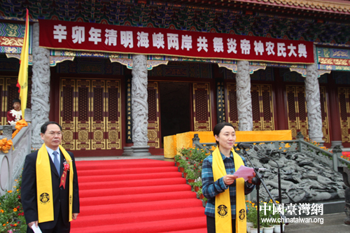 辛卯年清明海峽兩岸共祭炎帝神農(nóng)氏大典今日在湖南炎陵舉行。圖為祭祀儀式前,中共湖南省委常委李微微在致辭。(中國臺(tái)灣網(wǎng) 楊麗 攝)