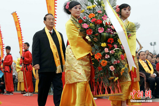 4月5日上午,中國(guó)·洪洞二十一屆大槐樹尋根祭祖大典在山西洪洞大槐樹尋根祭祖園舉行,中國(guó)臺(tái)灣親民黨主席宋楚瑜參加大典。圖為親民黨主席宋楚瑜祭祖敬獻(xiàn)花藍(lán)。中新社發(fā) 張?jiān)?攝