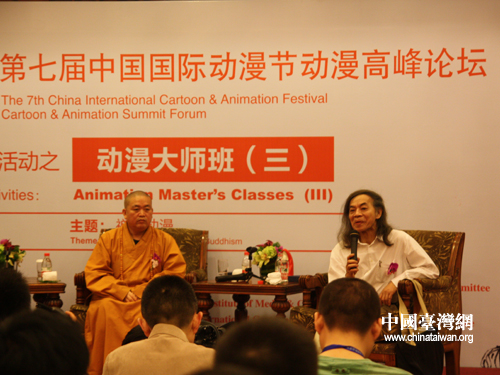4月29日,臺(tái)灣著名漫畫家蔡志忠出席第七屆中國國際動(dòng)漫節(jié),與少林寺方丈釋永信一起“禪說動(dòng)漫”。(中國臺(tái)灣網(wǎng) 李丹 攝)