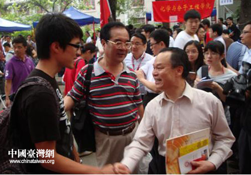 中國(guó)臺(tái)灣網(wǎng)8月29日北京消息 北京大學(xué)新生于八月二十七日正式報(bào)到,上午九點(diǎn)半校長(zhǎng)周其鳳由多名校務(wù)人員陪同來到港澳臺(tái)新生接待站關(guān)心新生報(bào)到狀況,并與接待學(xué)生團(tuán)隊(duì)拍照留念。