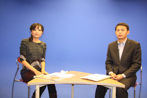 中國宋慶齡基金會聯(lián)絡(luò)部臺灣處李章程和中國臺灣網(wǎng)主持人董潔在節(jié)目錄制現(xiàn)場。(中國臺灣網(wǎng) 段富兵 攝)