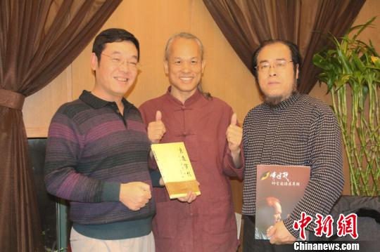 12月3日至8日,“臺(tái)灣民間博物館交流團(tuán)”一行20人在陜西參訪。圖為被譽(yù)為“臺(tái)灣微雕第一人”的陳逢顯先生與陜西文化名人切磋交流、相談甚歡,并接受著名書法家、書法理論家張珂贈(zèng)送的其書法理論專著《意造宋代》。 田進(jìn) 攝