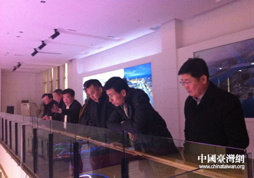 趙明一行邊看沙盤邊聽經(jīng)濟(jì)區(qū)領(lǐng)導(dǎo)介紹情況。(圖片來(lái)源:盤錦市臺(tái)辦)