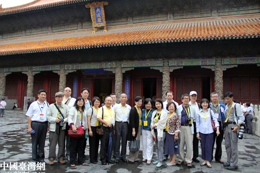 “情系齊魯——兩岸文化聯(lián)誼行”參訪團(tuán)嘉賓在孔廟內(nèi)的大成殿合影。(中國臺(tái)灣網(wǎng) 芮益芳 攝)