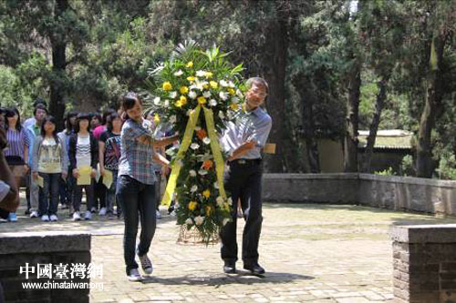 臺灣大學(xué)生領(lǐng)隊向“三蘇墳”敬獻(xiàn)花籃。(圖片來源:河南省臺辦)