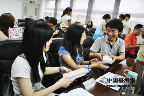 三峽大學自愿者與臺灣來宜師生互贈禮品。(中國臺灣網宜昌市通訊員 朱宜雄 攝)