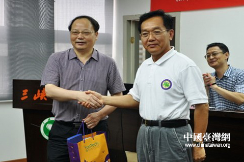 三峽大學副校長黃應平與臺灣云林科技大學許仲佑互贈禮品。(中國臺灣網宜昌市通訊員 朱宜雄 攝)