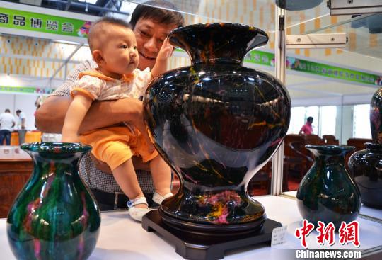 由新疆旅游局和克拉瑪依市人民政府主辦的首屆旅游商品博覽會(huì)10日在此間拉開(kāi)序幕,圖為新疆民眾帶著孩子觀看臺(tái)灣名石七彩玉制作的器物。孫亭文 攝