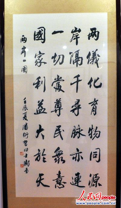 本次展出以“同根的文明”為主題,體現(xiàn)了兩岸文化同本同源,融合統(tǒng)一的美好遠景。全國政協(xié)常委、中國書協(xié)副主席蘇士澍先生的“兩岸一國”;中國藝術創(chuàng)作院院長嚴學章先生的“中華全家!;中國電影表演藝術學會會長、中國書法家協(xié)會會員唐國強先生的對聯(lián);著名書法藝術家、中國書協(xié)顧問劉藝先生的“望大陸”;當代著名書畫家侯榮亞先生的“伙伴”等等,都體現(xiàn)出了兩岸藝術家共同的對兩岸同根文化的認同和對兩岸融合統(tǒng)一的期盼。(記者 魯婧)