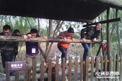 網(wǎng)媒記者們體驗?zāi)_踏水車。(中國臺灣網(wǎng) 樊玉嬌 攝)