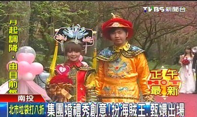 中新網(wǎng)2月19日電 據(jù)臺(tái)灣TVBS新聞臺(tái)報(bào)道,臺(tái)灣南投縣有13對(duì)新人19日在櫻花樹下完成終身大事。其中7對(duì)新人,穿的不是西裝白紗,而是走創(chuàng)意風(fēng),打扮成海賊王的喬巴,或是穿上日本和服,還有一對(duì)新人因迷戀古裝劇《后宮甄嬛傳》,刻意借道具,變身皇上和皇后。