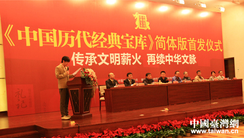 中國臺灣網(wǎng)5月9日北京消息 今天下午,由海峽兩岸出版界攜手編輯出版的《中國歷代經(jīng)典寶庫》簡體版首發(fā)式在北京舉行。國務(wù)院臺灣事務(wù)辦公室宣傳局處長尚君奇、中國友誼出版公司總經(jīng)理史寶明、著名作家梁曉聲、著名演員王剛等海峽兩岸出版界代表、文化界人士出席了首發(fā)式。