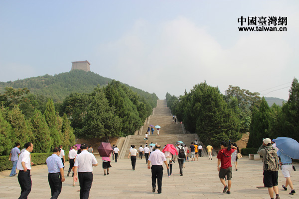 海峽兩岸記者要攀登524級臺階和18個平臺才能到達乾陵入口。(中國臺灣網(wǎng) 王文英攝)