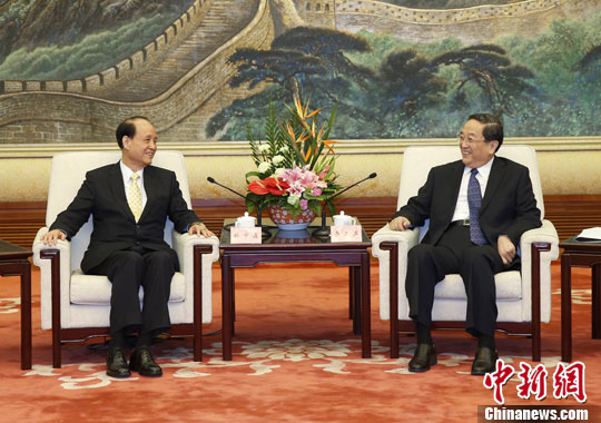 中新社北京9月12日電 (記者 路梅)中共中央政治局常委、全國政協(xié)主席俞正聲12日上午在人民大會堂會見了臺灣海基會董事長林中森率領的董監(jiān)事參訪團一行。