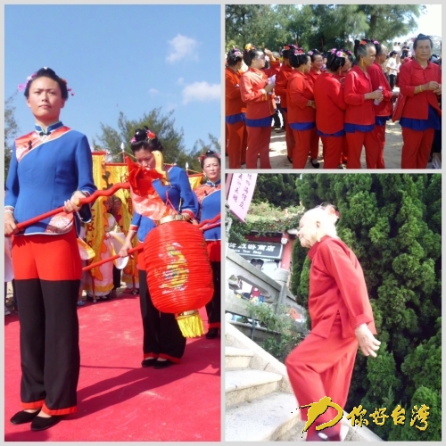 湄洲女服飾叫“媽祖裝”,海蘭色斜搭襟的中式上衣代表著大海的藍(lán);相處,媽祖喜愛紅色褲子,下黑上紅的寬大褲子是由于媽祖常年在海上救助漁民,褲子被海水打濕后遠(yuǎn)遠(yuǎn)看去像黑色,而上半截沒有被海水打濕的部分還是紅色的,久而久之衍化為上紅下黑的款式,紅黑分別象征吉祥與思念。