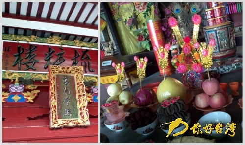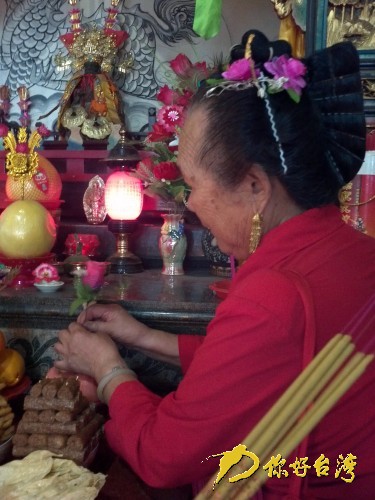 梳妝樓里的供品讓人印象深刻。幾個紅色的塑料盤里托著各式各樣的化妝品,種類繁多,有護(hù)膚品、有粉餅,還有頭飾。媽祖像前長期放置的一排供品也很有特色,香菇、餅、豆干等各種素食整齊地疊放,呈上小下大的寶塔狀,每個寶塔的頂端都插上一朵小紅花。或許,媽祖生前也愛紅花吧?