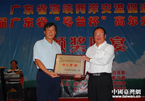 促進會副會長白瑞秋向承辦單位惠州市臺協(xié)贈送了感謝牌匾。省臺辦副主任、促進會常務(wù)副會長陳林佐主持見證了“粵臺杯”會旗交接儀式,他期望下一屆承辦單位汕頭市臺協(xié)、潮州市臺協(xié)、肇慶市臺協(xié)、云浮市臺協(xié)將下屆“粵臺杯”高爾夫球賽辦得更好。
