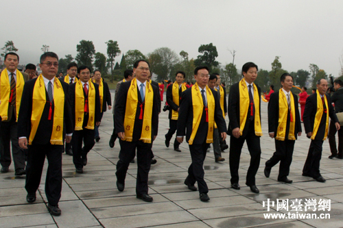 海協(xié)會(huì)副會(huì)長(zhǎng)李亞飛代(左三)、湖南省省長(zhǎng)助理袁建堯(左二),臺(tái)灣中華神農(nóng)大帝協(xié)進(jìn)會(huì)常務(wù)顧問(wèn)、東莞臺(tái)商子弟學(xué)校董事長(zhǎng)葉宏燈(左一)等兩岸相關(guān)負(fù)責(zé)人步入炎帝陵祭祀廣場(chǎng)。(中國(guó)臺(tái)灣 高斯斯 攝)