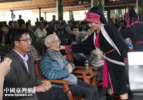 參加表演的黎族少女把“捏耳朵”禮節(jié)送給余光中先生。(中國(guó)臺(tái)灣網(wǎng) 李瑞艷 攝)