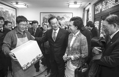 昨日,中國國民黨榮譽主席連戰(zhàn)夫婦向小提琴制作師常中秋贈送禮物。張浩 攝