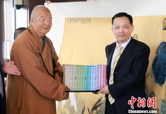 東盟-中國書畫家協(xié)會榮譽主席、大陸著名書畫家君壽12日來到高雄佛光山佛陀紀念館,拜會佛光山開山宗長星云大師,并將其歷時一年所完成長六米、寬一點五米的巨幅畫作《佛光普照金色荷塘》圖,贈予大師。星云則以《百年佛緣》系列叢書回贈。