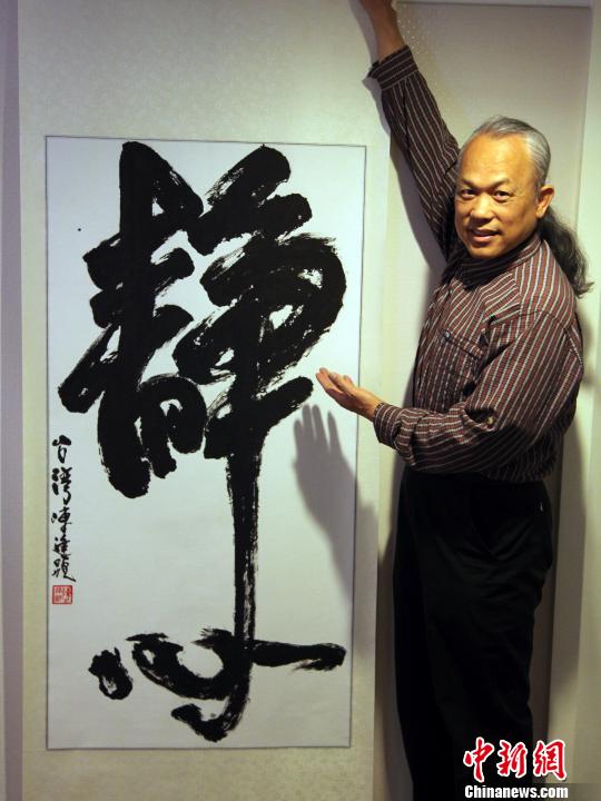 圖為2014新北市美術(shù)家聯(lián)展。臺(tái)灣知名藝文家陳逢顯與他參展的書法作品“靜心”!£惲⒂睢z