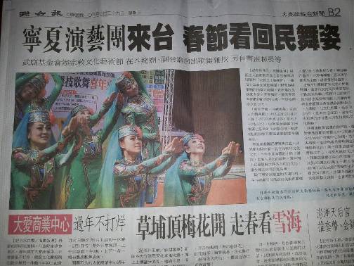 本次演出,也受到了臺(tái)灣新聞媒體的廣泛關(guān)注。臺(tái)南、高雄、南投等十幾家電視臺(tái)以及《聯(lián)合報(bào)》、《民眾日?qǐng)?bào)》、《焦點(diǎn)新聞》等報(bào)紙和網(wǎng)站等媒體,對(duì)寧夏民族歌舞雜技演出情況進(jìn)行了宣傳報(bào)道。在演出預(yù)熱階段,邀請(qǐng)方在高雄舉辦了由《聯(lián)合報(bào)》、《民眾日?qǐng)?bào)》、《焦點(diǎn)新聞》等報(bào)紙和“中視”媒體參加的新聞發(fā)布會(huì)。會(huì)后眾多媒體紛紛刊發(fā)宣傳報(bào)道,1月29日,《聯(lián)合報(bào)》頭版頭條刊登新聞,題目為《寧夏演藝團(tuán)來臺(tái) 春節(jié)看回民舞姿》,并附上一幅美麗的回族姑娘跳舞的劇照。報(bào)道中評(píng)價(jià):“寧夏演藝團(tuán)赴臺(tái),讓臺(tái)灣民眾更了解大陸多方面的文化,讓臺(tái)灣民眾春節(jié)更高興。婀娜多姿的回族舞蹈不僅提供了民眾春節(jié)期間的休閑盛宴,也促進(jìn)了兩岸文化交流”。高雄市榮民之家專門致“茲感謝寧夏演藝集團(tuán)蒞臨本家舉辦敬老關(guān)懷活動(dòng),嘉惠榮民,特贈(zèng)此狀,以表謝忱”的感謝狀。獨(dú)具特色的回族歌舞雜技在島內(nèi)掀起了一股“寧夏旋風(fēng)”。