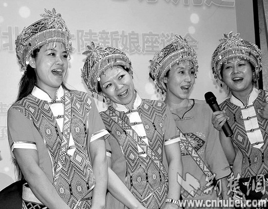 圖為:湖北籍大陸新娘座談會(huì)上,來(lái)自恩施州的姑娘們一起唱起土家族民歌“六口茶”。