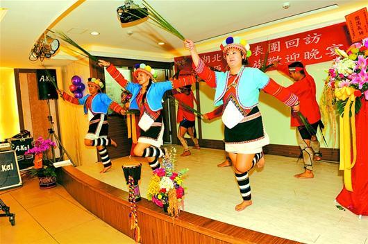上圖:臺(tái)灣少數(shù)民族同胞載歌載舞,歡迎遠(yuǎn)道而來(lái)的湖北朋友。