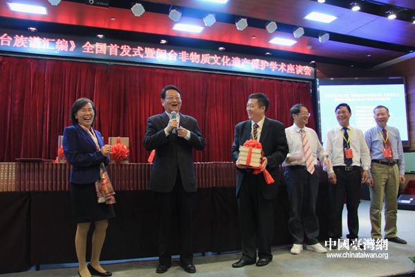 《臺(tái)海文獻(xiàn)匯刊》、《閩南涉臺(tái)族譜匯編》29日在京首發(fā),圖為全國(guó)臺(tái)聯(lián)會(huì)長(zhǎng)汪毅夫接受閩南師范大學(xué)贈(zèng)書(中國(guó)臺(tái)灣網(wǎng) 李徽 攝)