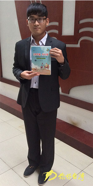 來自高雄岡山高三蔡孟學代表臺灣學生發(fā)言,他說:“這次征文‘中華情·少年夢’這個主題真好,一個‘情’字,寄托著我們兩岸青少年美好的夢,這個夢就是我們中華民族能夠實現(xiàn)偉大復興、共創(chuàng)美好未來的夢!碧岬绞斋@,蔡孟學拿起手中的征文大賽優(yōu)秀文集說,這就是最大的收獲,“通過這本書能夠了解大陸同學們的想法和現(xiàn)狀。”他還笑言,作文是一種“無聲勝有聲”的情感交流方式,雖然簡體字有些看不懂,但這也是一種交流的方式。