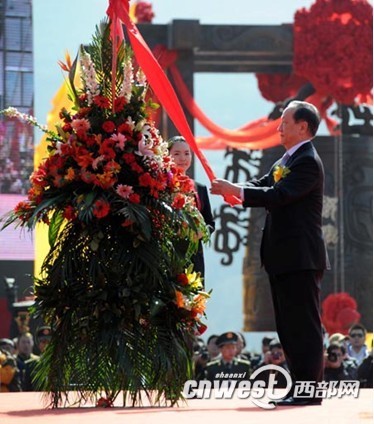 郁慕明在壬辰(2012)年清明公祭軒轅黃帝典禮上敬獻(xiàn)花籃。(資料圖片)
