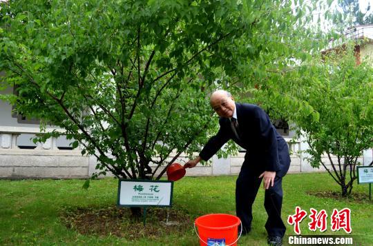 葉昌桐將軍為梅花澆水。 陳惠端 攝