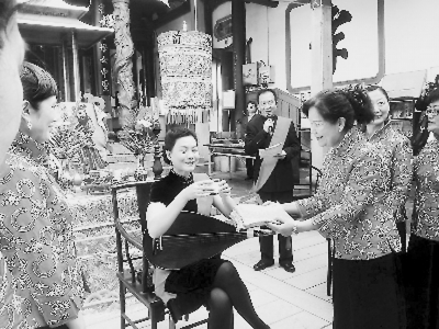 李白燕一行高水準(zhǔn)的教學(xué)和敬業(yè)精神也深深打動(dòng)了臺(tái)灣的學(xué)員們,課程結(jié)束時(shí)他們已經(jīng)難舍難分。從此,通過電話和微信,相隔海峽兩岸的師生們聯(lián)系從未中斷,借助錄音錄像帶等,學(xué)習(xí)也一直在持續(xù)。2012年12月,“福建省南音表演藝術(shù)家李白燕收徒儀式”在臺(tái)南大天后宮舉行(上圖),12位臺(tái)灣弟子按照曲藝界拜師學(xué)藝的傳統(tǒng)禮俗正式拜李白燕為師。兩年后,時(shí)為福建省勞動(dòng)模范的李白燕入臺(tái)參訪,學(xué)生們聞?dòng)崗膷u內(nèi)四面八方趕往她下榻的酒店,既為看望恩師也是抓住難得的機(jī)會(huì)當(dāng)面求教。