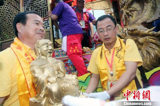 湖南神農(nóng)大帝祖廟圣駕,6月6日至16日首次赴臺(tái)灣巡境賜福。圖為圣駕抵臺(tái),在新北市三重先嗇宮駐蹕安座,受到廟方及信眾盛大歡迎。 黃少華 攝
