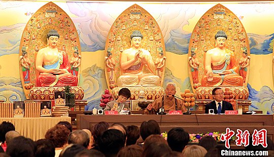 9月21日,臺灣佛光山開山宗長星云大師(中坐者)在臺北發(fā)表《星云智慧》,新書收錄他1951年至今最重要的100篇文章。中國國民黨臺灣地區(qū)領(lǐng)導(dǎo)人選舉參選人洪秀柱(左一)受邀出席,她推崇星云大師一生推動人間佛教的貢獻(xiàn)。中新社發(fā) 劉舒凌 攝