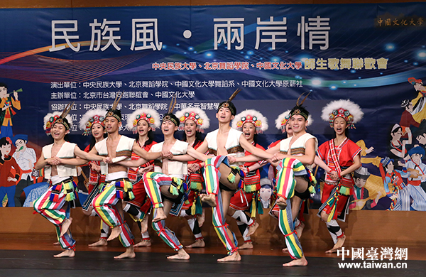 3日晚間,第四屆兩岸族韻喜福匯暨兩岸少數(shù)民族大聯(lián)歡演出活動(dòng)在中國(guó)文化大學(xué)舉行,兩岸少數(shù)民族青年同臺(tái)演出。圖為中國(guó)文化大學(xué)舞蹈系同學(xué)表演阿美族豐年祭舞。(中國(guó)臺(tái)灣網(wǎng) 普燕 攝)