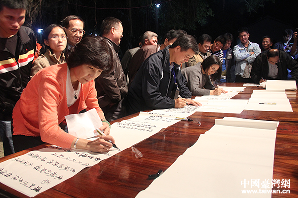 書院內(nèi)無處不見的詩文碑帖和濃郁的文化氛圍,也激起了大家的詩興。當(dāng)晚的兩岸詩人聯(lián)誼活動(dòng)上,在婆娑樹影,徐風(fēng)晴空下,兩岸詩人紛紛揮毫潑墨,書寫詩情。