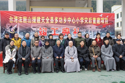 中國臺(tái)灣網(wǎng)1月22日四川訊 1月21日,臺(tái)灣法鼓山援建“4.20”蘆山地震災(zāi)后重建項(xiàng)目——雅安天全縣多功鄉(xiāng)中心小學(xué)舉行竣工儀式。四川省臺(tái)辦主任周敏謙、省人大民宗委主任王增建、省民宗委副主任楊伯明與臺(tái)灣法鼓山住持果東法師等出席竣工典禮并為學(xué)?⒐そ遗啤碜耘_(tái)灣、香港等地的法鼓山信眾、義工和當(dāng)?shù)厝罕妿熒?00余人參加竣工儀式。