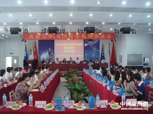 臺灣青年教師參訪團(tuán)與新疆兵團(tuán)三中教師交流座談。(圖片來源:新疆生產(chǎn)建設(shè)兵團(tuán)臺辦)