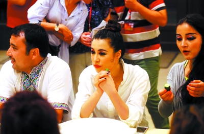 4月5日清晨5時多,古麗敏仁和十多位伙伴帶著家鄉(xiāng)人烤出的馕出發(fā)了。整整兩天,行程1萬多公里,大家才終于抵達了演出第一站——臺灣臺中市。寶島的空氣真濕潤啊,滿目綠意盎然。走出大漠走進寶島的第一天,古麗敏仁就被迷住了。可顧不上欣賞美景,古麗就和同伴們投入了緊張的排練。和田樂舞以其熱情奔放的魅力常常被安排為整場演出的壓軸。這意味著無論排練還是演出,姑娘們都要付出更長時間的等待,但這可沒能讓古麗犯難。團里為這次寶島之行準備了4個精品節(jié)目,每個節(jié)目的服裝服飾截然不同。一次不到十分鐘的登臺表演最多需要長達三個小時的化裝準備。維吾爾姑娘獨特的化裝風格和技巧甚至吸引了眾多同行來學(xué)習。“她們的化裝更偏向戲劇感,棱角分明層次突出!眱(nèi)蒙古歌唱家格日樂圖雅連學(xué)三天,忍不住贊道。