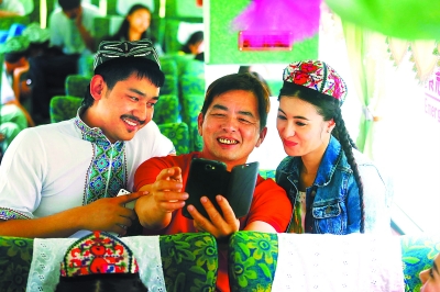 ▲ 在演出地點之間轉(zhuǎn)場動輒幾個小時,早出晚歸成了文化之旅團員們的常態(tài),而大巴車則成了演員們臨時的“家”。一直跟隨著演出團四處奔波的當?shù)貙?dǎo)游跟著團隊看了一場又一場表演,直言自己已經(jīng)是鐵桿粉絲,閑暇時間他還會把自己在觀眾席上錄下的演出視頻拿出來回放,請演員們一同欣賞回味。