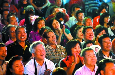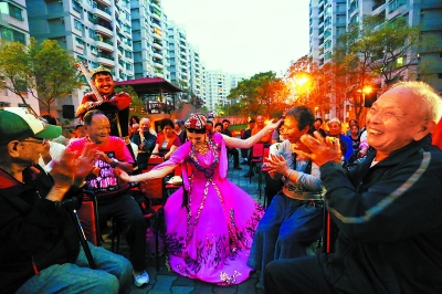 ▲ 臺南市長榮里長榮社區(qū)是現(xiàn)在臺南最大的眷村改造社區(qū),這里的2000余戶居民來自10個眷村,眾多臺灣大陸老兵居住在這里。為了迎接演出團,居民們提前三四個小時就聚集在社區(qū)的露天小舞臺前。為了讓這群特殊的觀眾了解新疆樂舞的魅力,古麗和同伴們走到觀眾席中間打起手鼓唱起歌,感染了眾多老人。