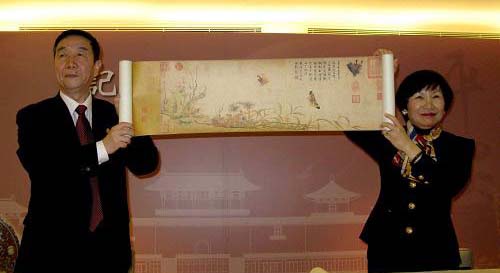 3月2日,鄭欣淼(左)與周功鑫共同展示故宮博物院贈送的宋朝趙昌的《寫生蛺蝶圖》復(fù)制品。