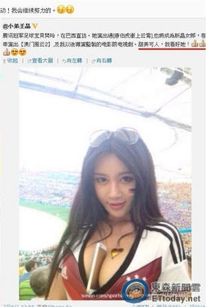 據(jù)臺灣媒體報道,“北師大;ā狈嵋蜷L相酷似影星范冰冰和關(guān)之琳的綜合,加上身材豐滿、凹凸有致,在網(wǎng)路上一夕暴紅。近日巴西世足進(jìn)入最后高潮,前往巴西觀賽的她,近日也在微博上“應(yīng)景”以乳溝夾手機(jī)的方式聲援自己支持的德國隊,不只吸引網(wǎng)友目光,連大導(dǎo)演王晶都在微博上推薦,并稱“甜美可人,我看好她!”