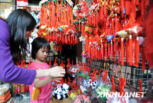 5月19日,一名小朋友在臺(tái)北市街頭選購端午香包。端午節(jié)臨近,各式各樣的香包在臺(tái)北上市,熊貓?jiān)煨偷南惆绕涫艿胶⒆觽兿矏。新華社發(fā)(吳景騰 攝)
