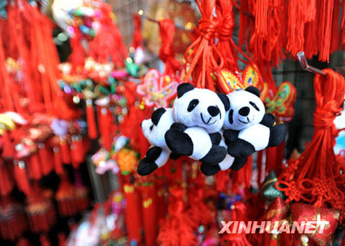5月19日在臺(tái)北市街頭拍攝的熊貓?jiān)煨偷亩宋缦惆。端午?jié)臨近,各式各樣的香包在臺(tái)北上市,熊貓?jiān)煨偷南惆绕涫艿胶⒆觽兿矏。新華社發(fā)(吳景騰 攝)