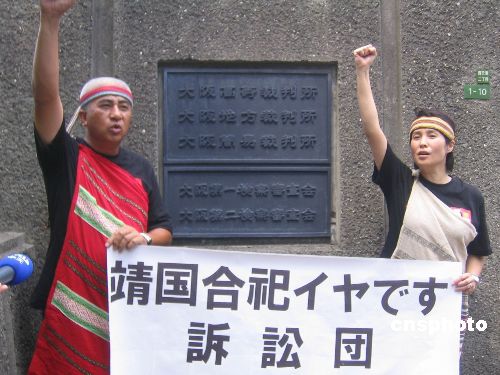 資料圖片:2006年,高金素梅在日本大阪地方法院再度提出起訴,反對日本首相參拜靖國神社,要求將“二戰(zhàn)”時期被強行驅(qū)入戰(zhàn)場的“高砂義勇隊”的靈位從靖國神社取回。圖為起訴前高金素梅等在法院門前呼喊口號。 中新社發(fā) 日本分社 攝
