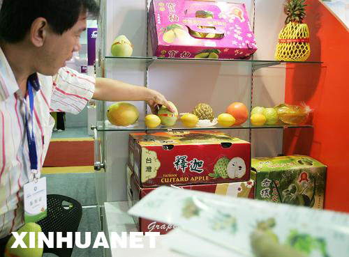 9月2日,一位展商在擺弄攤位前的臺灣水果。